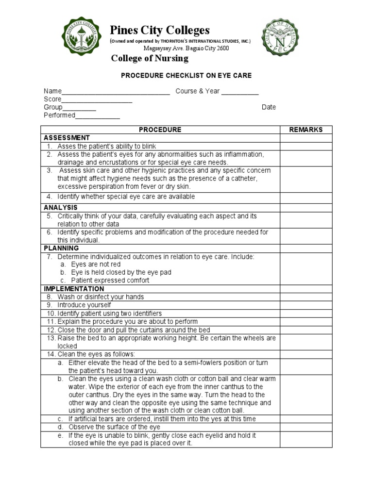 Procedure Checklist On Eye Care Pdf Hygiene Health Care